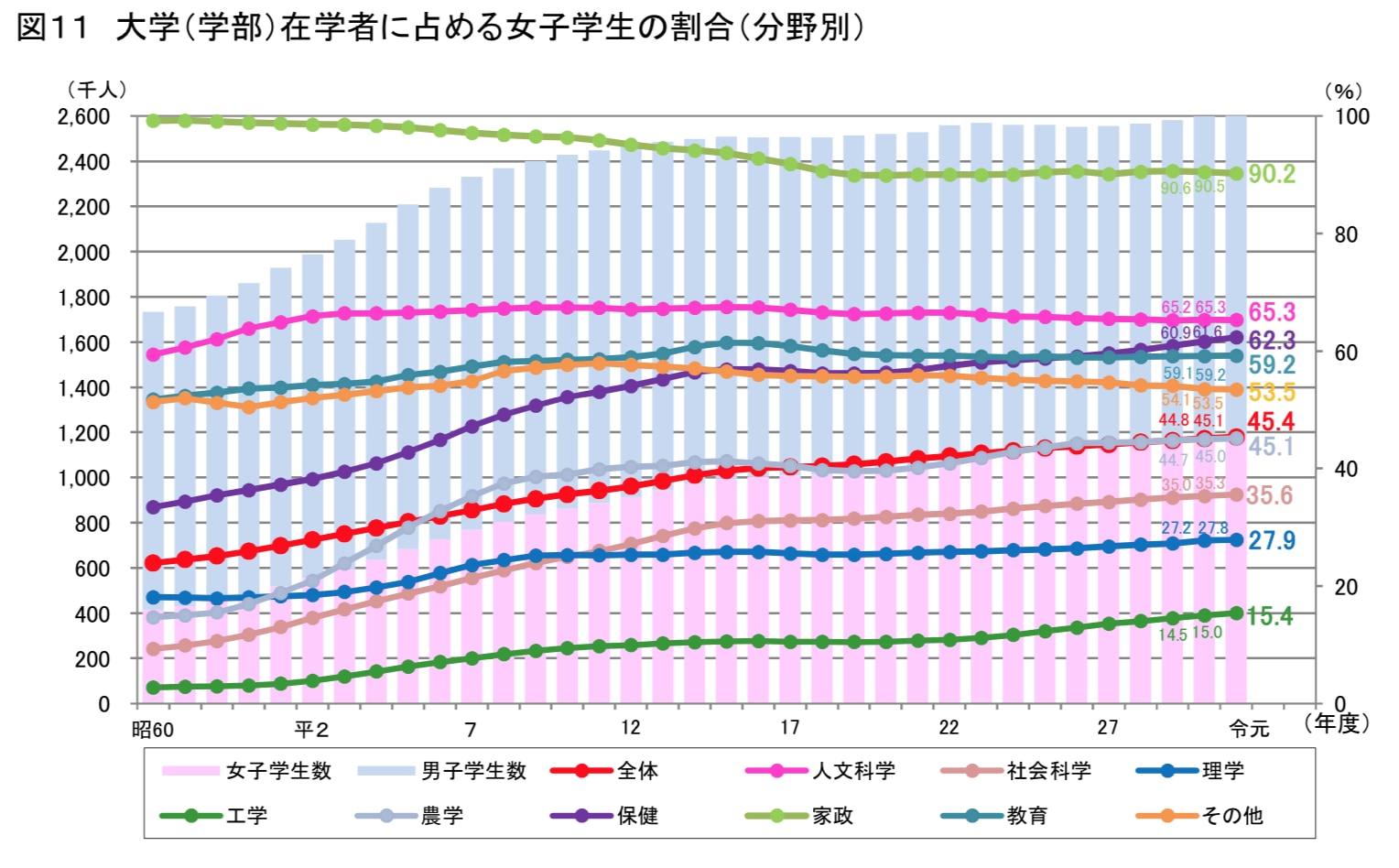 他方、理系全体では女性は増えています。しかし、増えているのは薬学部とか農学部、歯学部など情報系とは遠い分野です。実はもともと足りない情報や機械の分野は、まだ女性が十分に増えていないんです。(※1)
