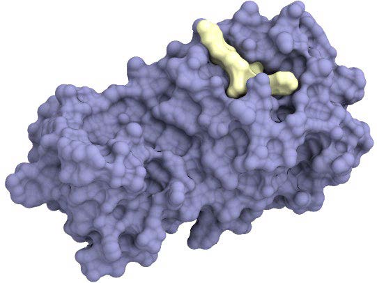 新型コロナウイルスのメインプロテアーゼ(紫色)に結合して増殖を阻害する薬剤(黄色)のイメージ