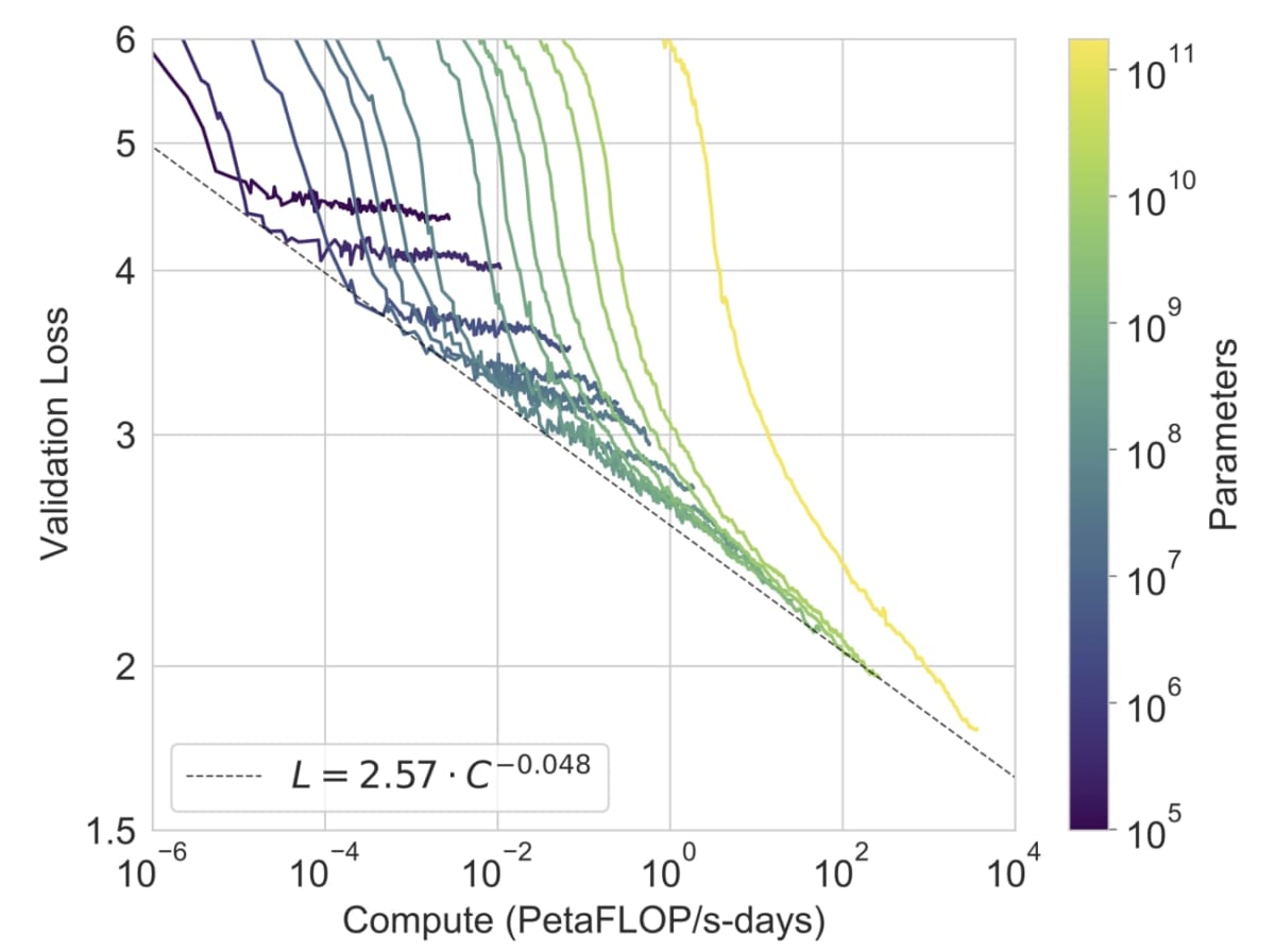 論文中では、これは計算量(=訓練に必要な計算の量)とのべき乗則として表されていますが、この規則に従うとモデルは大きければ大きいほど良い性能を示すことになります。
