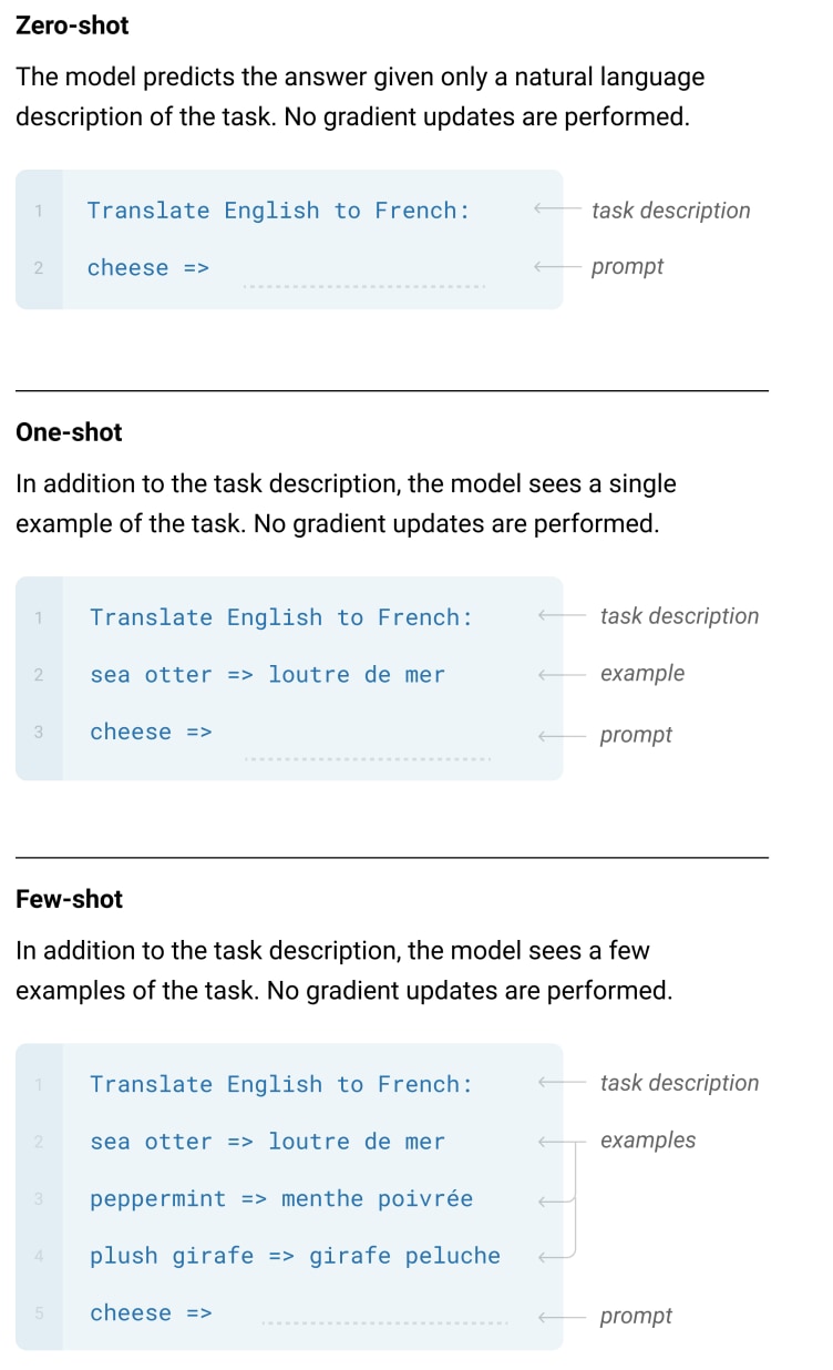 これらの特筆すべき点は、タスクの実行時にファインチューニングを行わない(=パラメータの更新をしない)ということです。