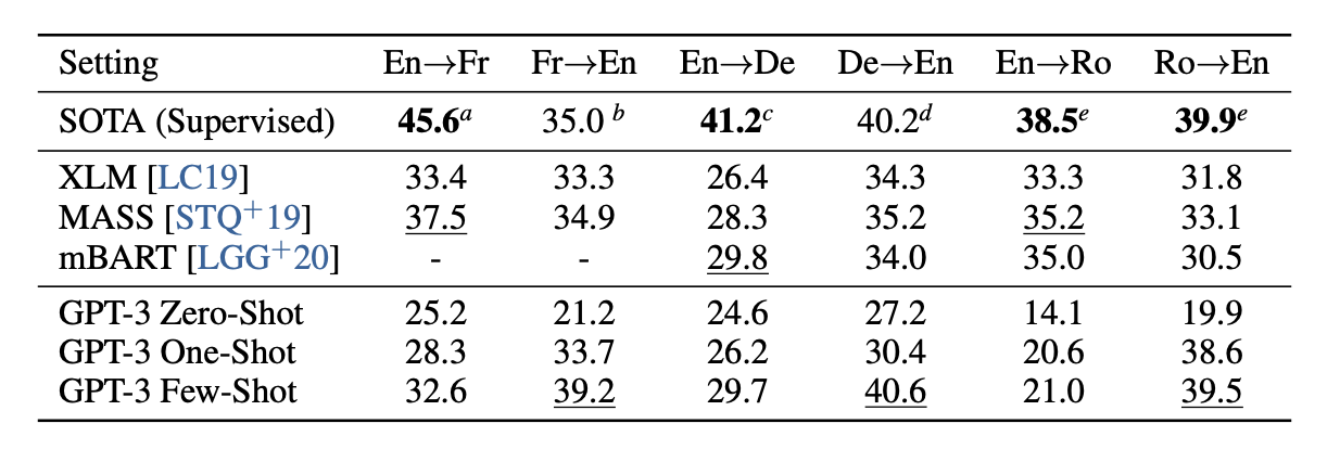 SOTAの行が最高性能のスコアで、下のGPT-3 *がGPT-3の性能ですが、英語に翻訳したい場合には、GPT-3が最高性能に迫っていることがわかります。また、例を与えれば顕著に精度が上がることも観測できます。