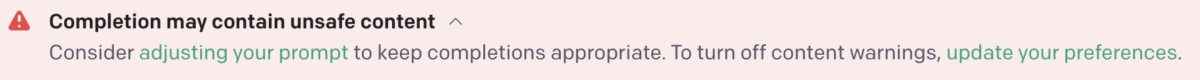 しかし悪用される危険性があることから、GPT-2やGPT-3のモデルは公開されておらず、現在はAPIのみで使用可能となっています。また、API使用の際も出力結果の安全性担保のため、危険な出力には以下のようなアラートが出る仕様になっています。